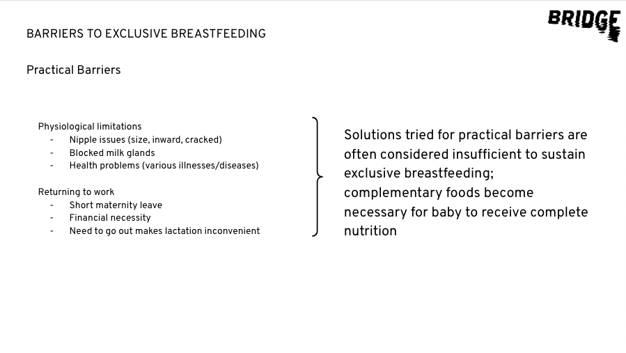 Faced with persistent perceptions around good infant nutrition and challenging practical behaviours throughout the first six months, lactating women and their ‘village’ were not confident in exclusive breastfeeding being nutritionally enough for their babies, especially at moments like illness or changing of milk consistency.