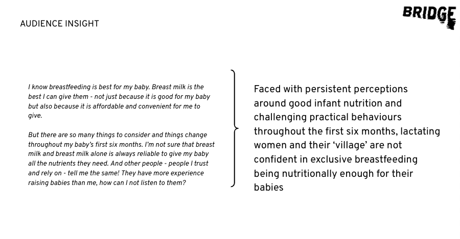 We were surprised that knowledge of best practices was high. But this knowledge was not enough to affect behaviours, and moments of doubt were enough to break positive habits like exclusive breastfeeding.