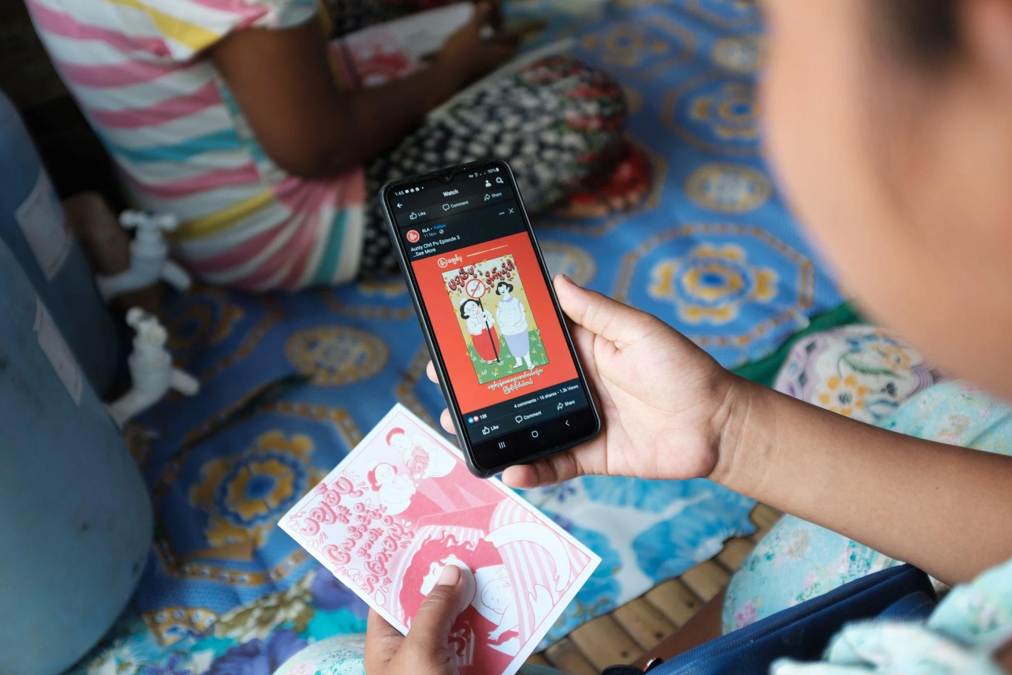 "In my spare time, I use Facebook to read articles I can apply to my motherhood. There is a Facebook page named 6la (six months), and I read the articles with the character 'Ma Chit Pu'. Reading these articles teaches me how to have nutritious meals as a lactating mother, and I apply this knowledge daily."