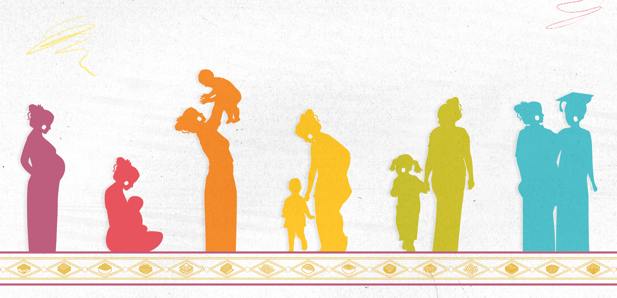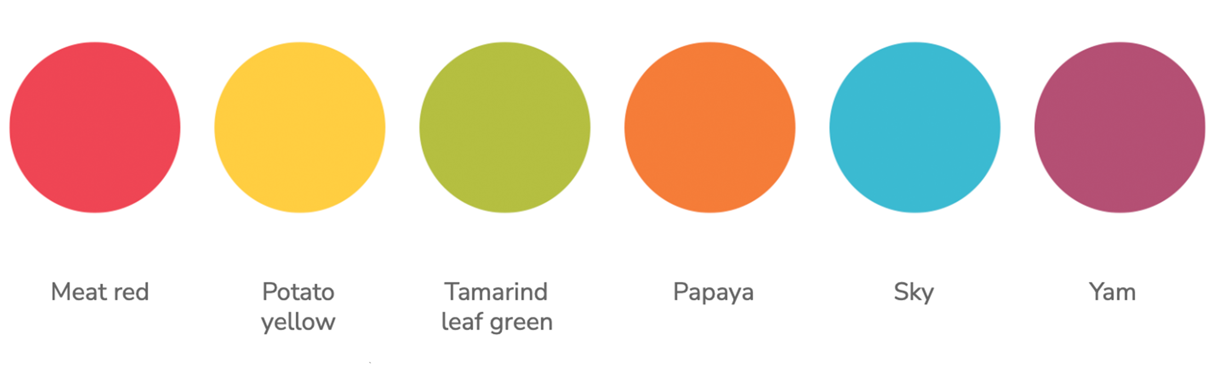Food items were simplified and weaved into the lacquer pattern. Influenced by patterns often seen in Myanmar textiles, we created seven interwoven layers of patterns for each food group. This design approach aimed to provoke a sense of familiarity to draw the audience in. On the other hand, this is a reminder that eating variety could be as simple as mixing and matching different foods that were already easily available around the mothers. We presented the diet model as a visual diagram that contains different food groups and examples with suggested portions to educate pregnant and lactating mothers on dietary diversity. We created a poster with the diet model to be used as a quick reference.